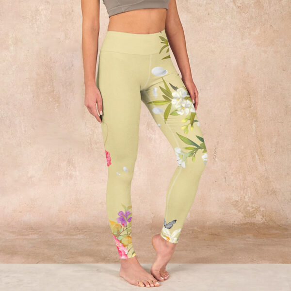 - Design Inspiration: The leggings feature a design of Flowers. Plants. and Butterflies. symbolizing transformation. beauty. and the interconnectedness of nature. The vibrant flowers represent growth and vitality. while the butterflies signify change and freedom. creating a harmonious pattern that celebrates the cycle of life and the joy found in nature’s diversity.