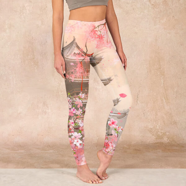 - Design Inspiration: The leggings feature a design of Pink Sakura and Antique Buildings. symbolizing the beauty of fleeting moments. The delicate pink sakura represents renewal and the transient nature of life. while the antique buildings evoke a sense of history and tradition. together celebrating the harmonious blend of nature and architectural elegance.