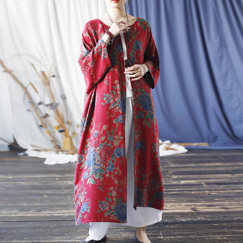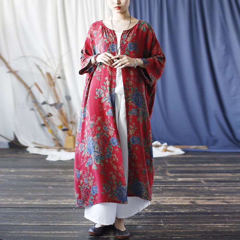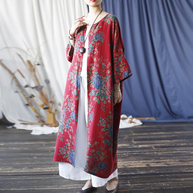 Buddha Stones Red Blue Flowers Print Cotton Three Quarter Sleeve Open Front Jacket Coat